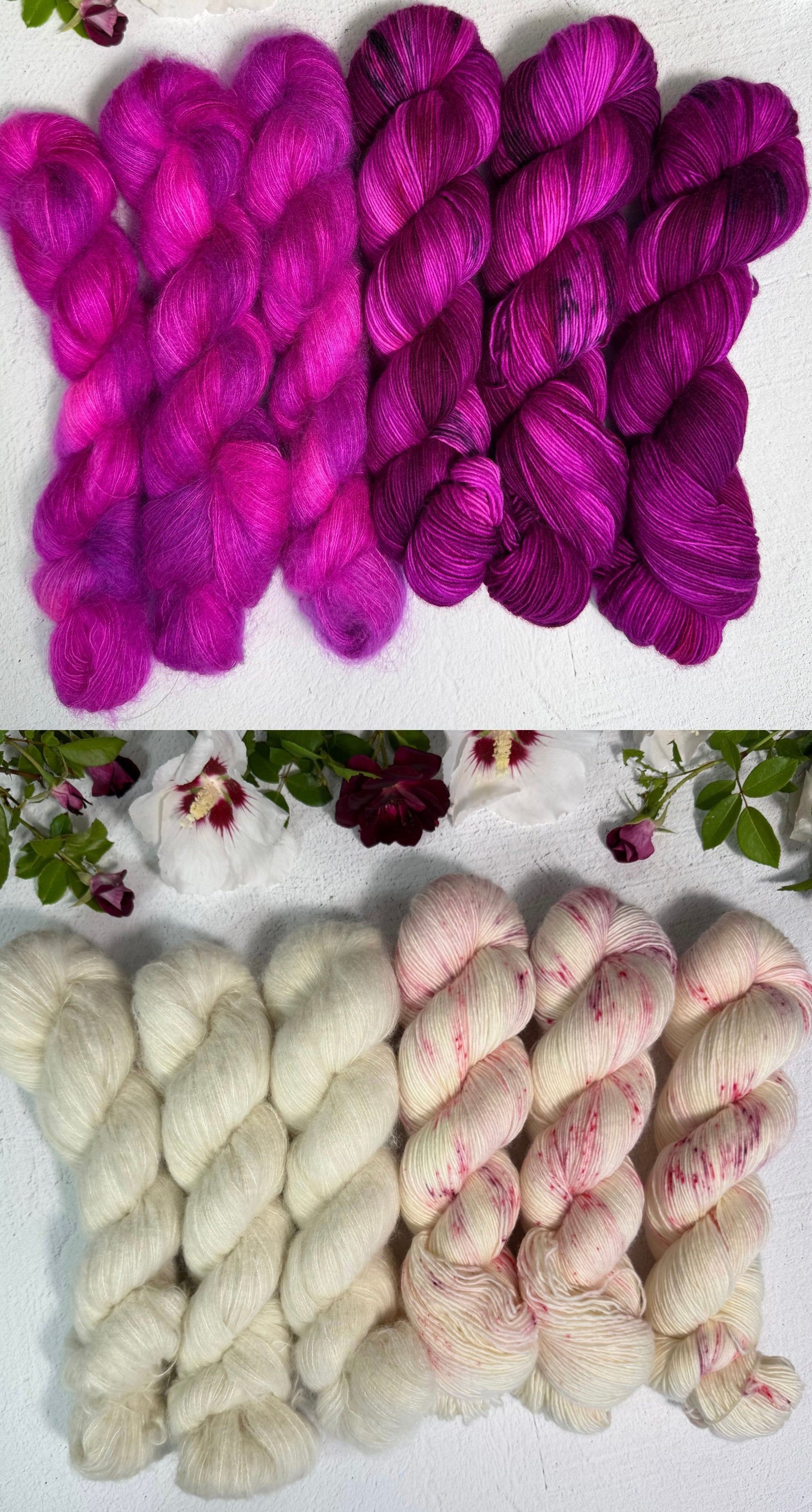 I've designed two stunning pink themed colorways in honor of my loved one and all of the strong women who have fought or are fighting against breast cancer. Cheryl from CocoAmour Knitwear is donating all of her pattern sales in the month of October to breast cancer charities. Thank you from the bottom of our hearts for supporting this mission.
