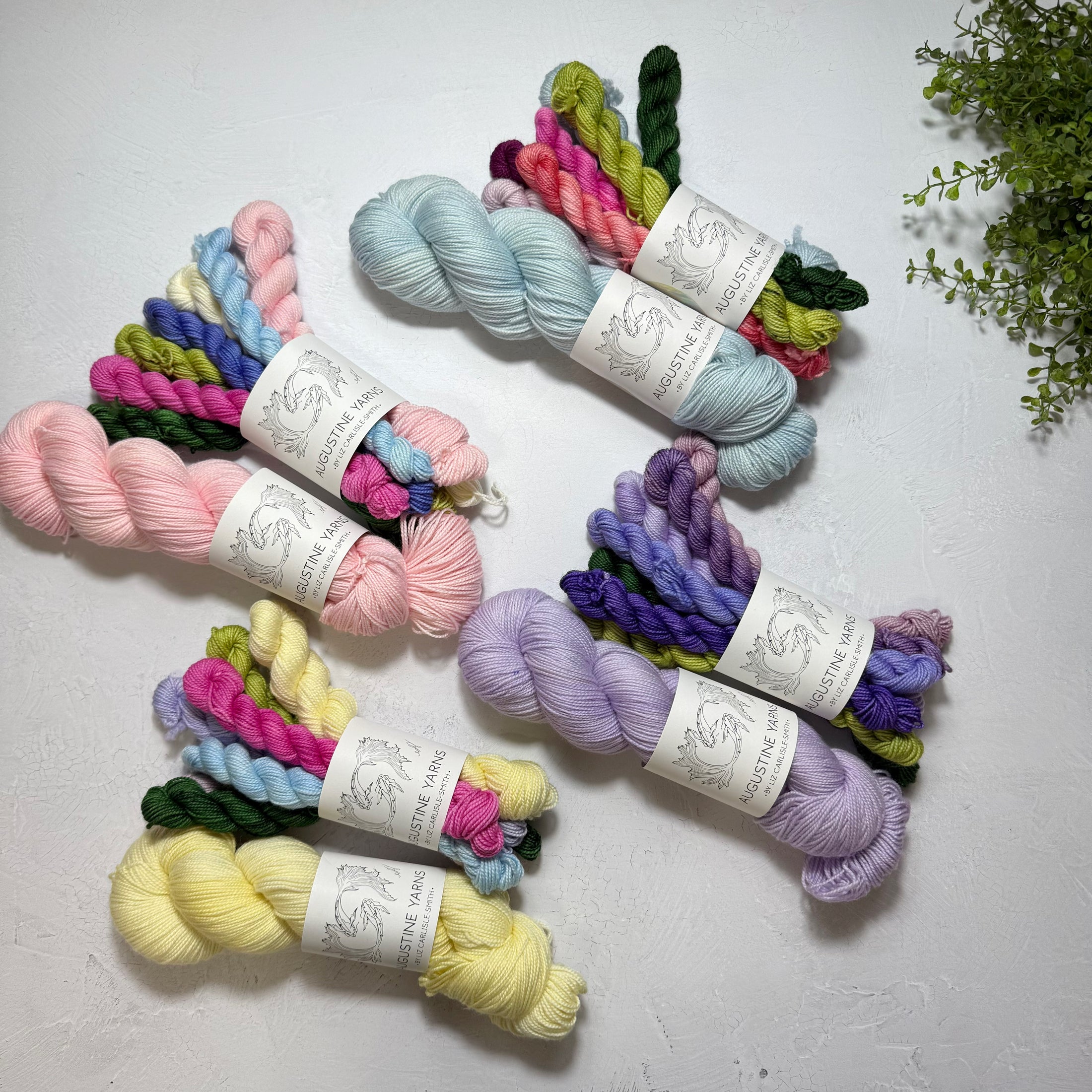 400g total- mystery fade skeins, a printed cotton drawstring project bag, and handmade markers by me! Made to add a little whimsy to your winter! Click the image for more info!